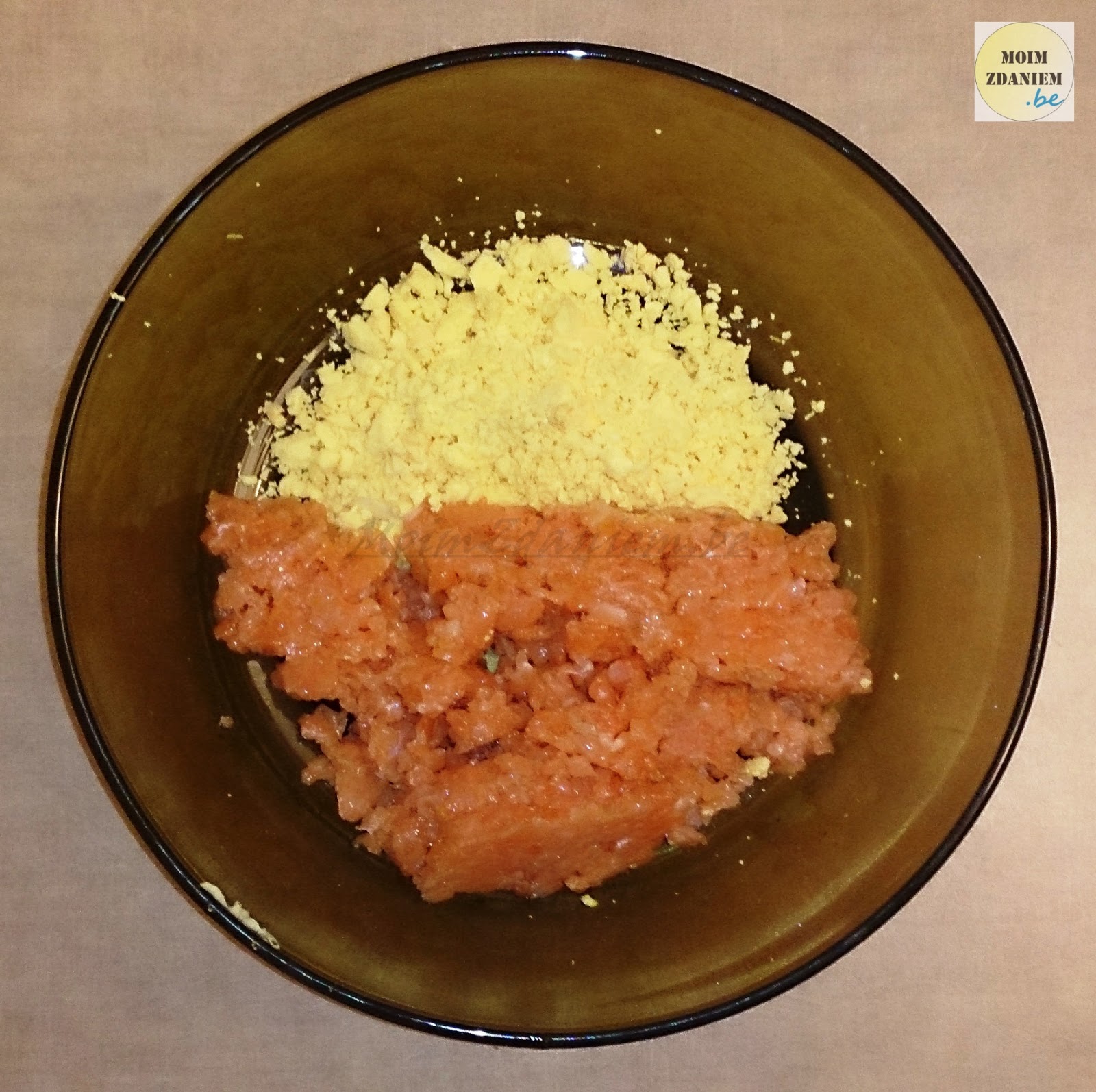 • żółtka i łososia szatkujemy drobno i wrzucamy do miski
