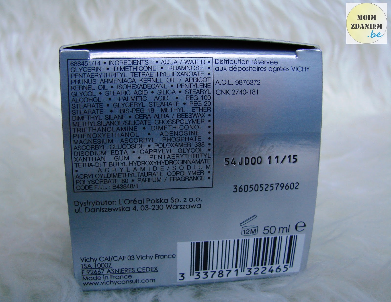 Vichy Liftactiv ma delikatny, neutralny zapach. Konsystencja kremu jest dość zbita i śliska, odrobinę trudno się go nabiera. Nie jest natomiast tłusty i z powodzeniem nadawałby się do stosowania na dzień tak jak zaleca producent.